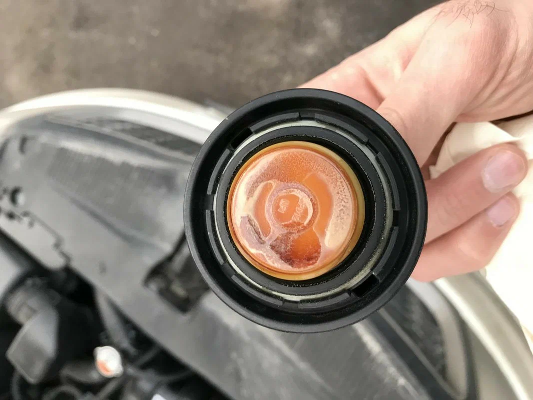 При проверке масла обнаруживается белый налёт под крышкой, который списывается на конденсат.