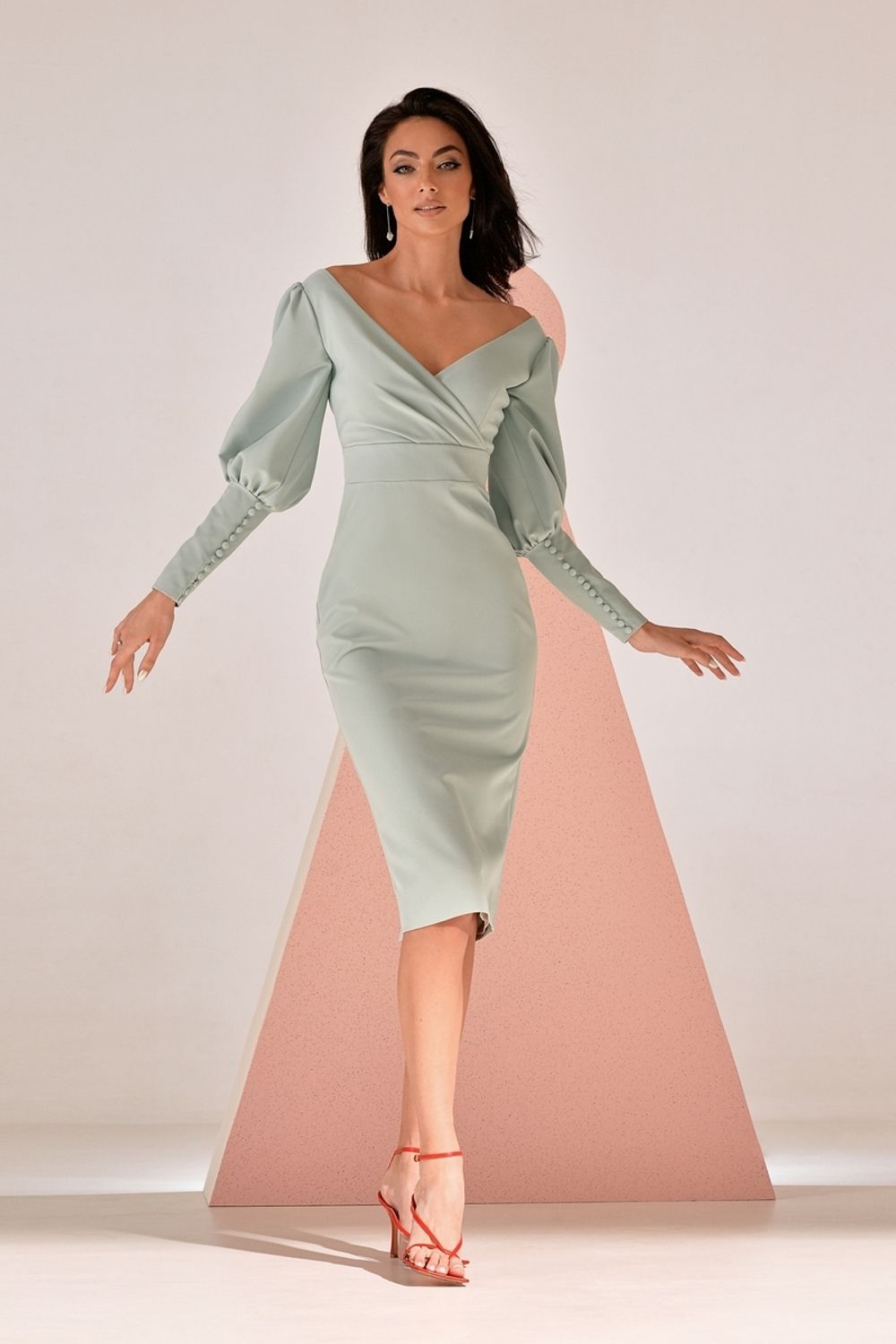 - Актуальны платья с воротником-стойкой или V-образным вырезом. Также популярен вырез "халтер", элегантно открывающий плечи.